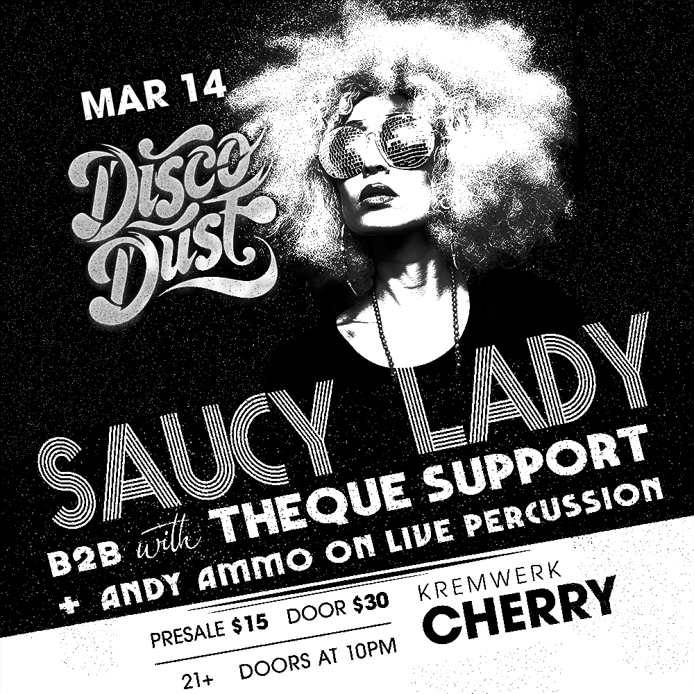 Disco Dust is excited to welcome Saucy Lady to Seattle. Boston's own Beantown Disco Queen has been spreading her space-age groove across dance floors worldwide since 2011, with four albums deep in funk, boogie, and disco and over 60 releases to her name, mostly on wax. A classically trained vocalist, songwriter, DJ, and founder of the vinyl-first label Dippin' Records, Saucy Lady doesn't just play the music. She lives it, makes it, and presses it to vinyl. She is the real deal.
